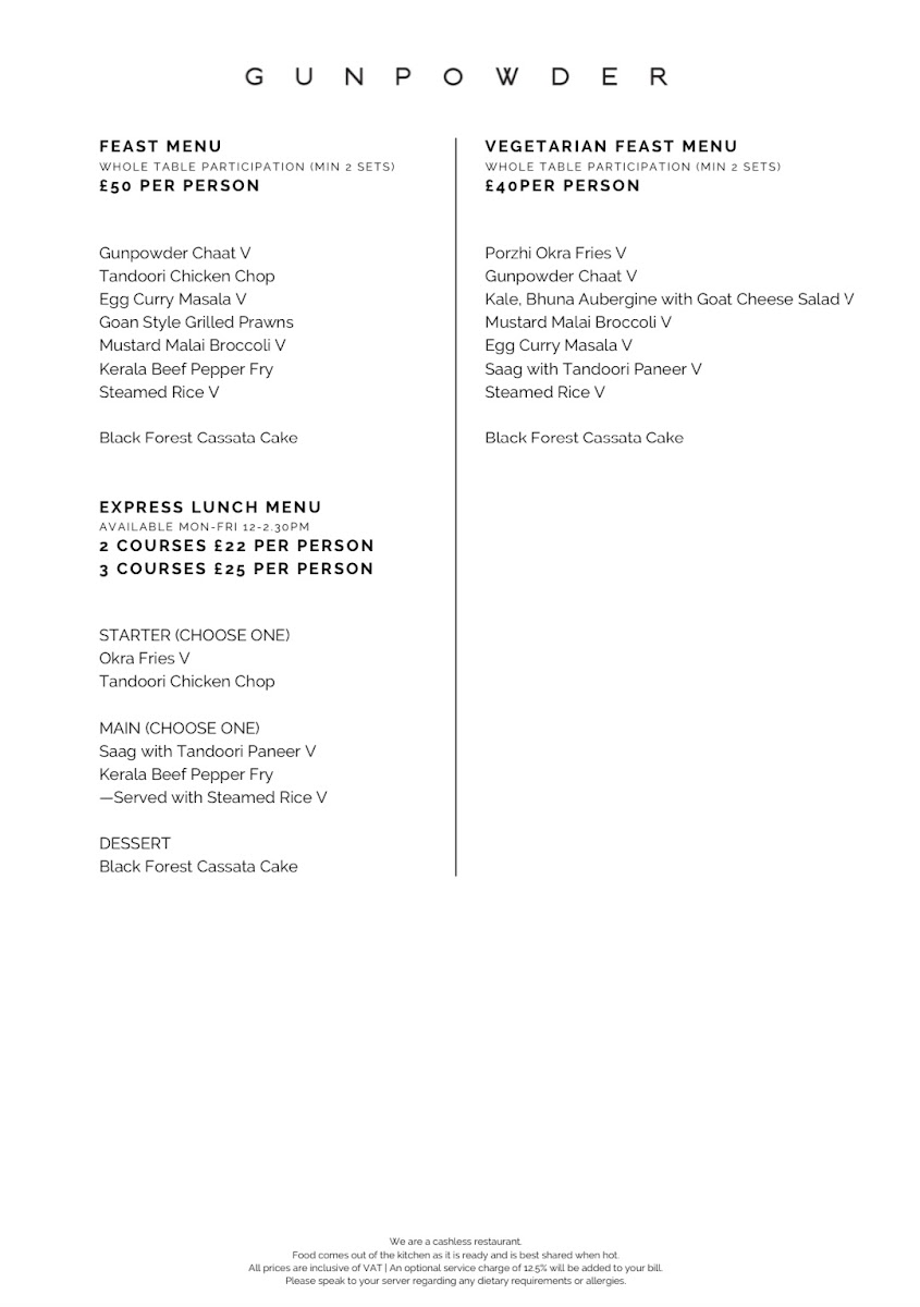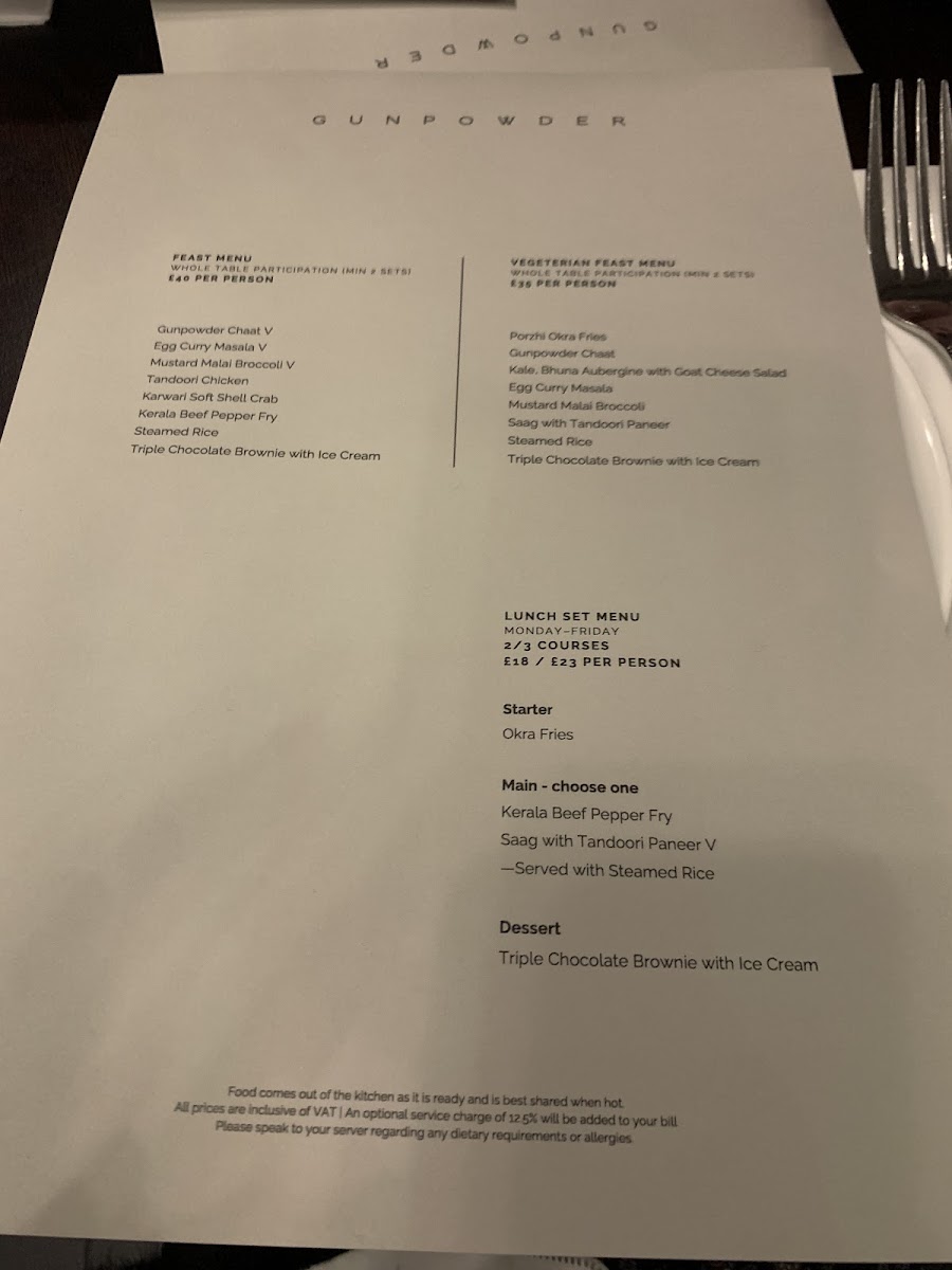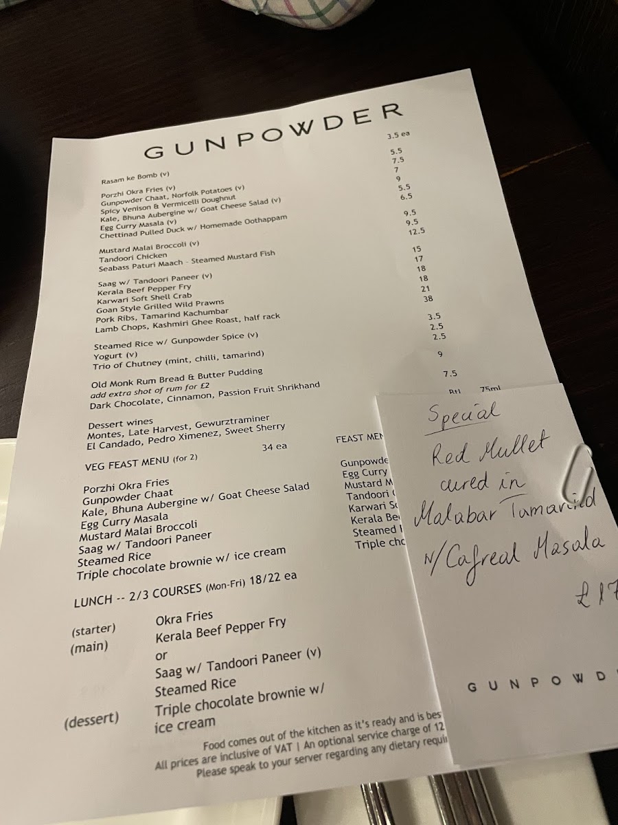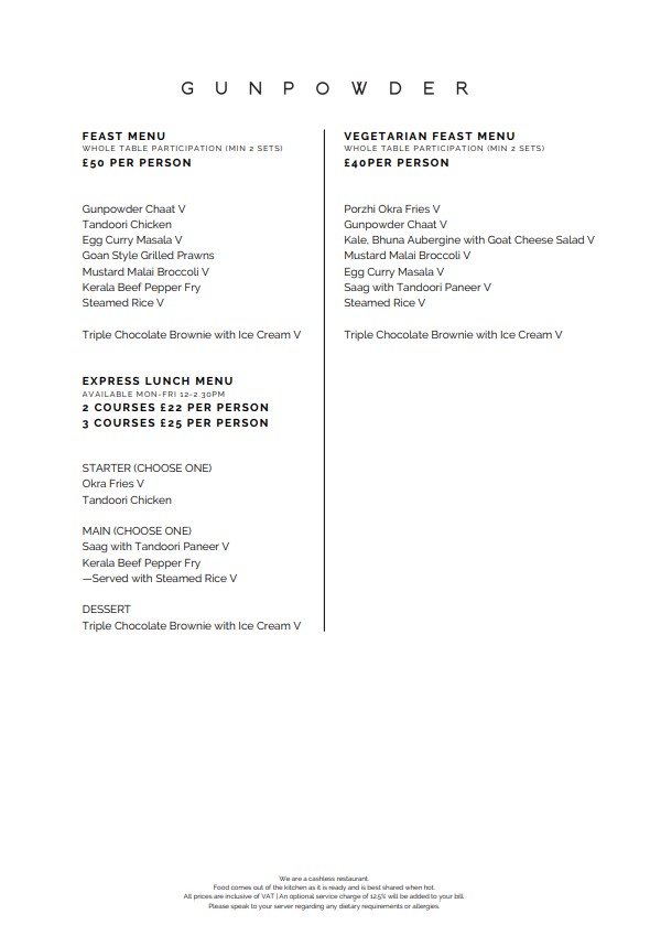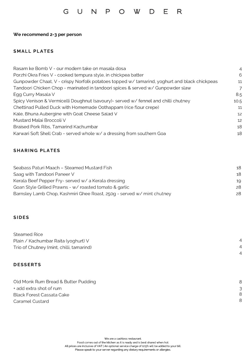 Located at 11 White's Row, London E1 7NF, Gunpowder offers a remarkable dining experience rooted in rich Indian flavors with a modern twist. The menu showcases a variety of dishes that embrace bold spices and unique combinations, with a focus on providing a fresh perspective on traditional Indian cuisine.